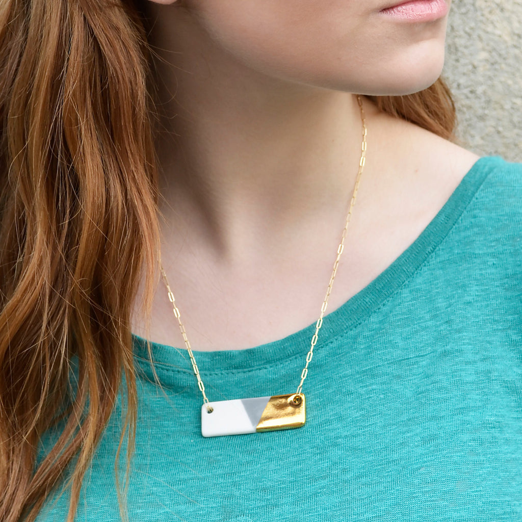 Large Gold Dipped Porcelain Bar Necklace in Gray