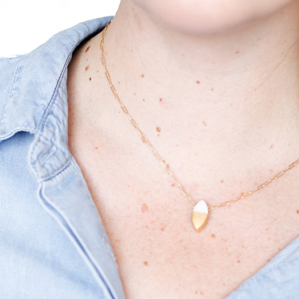 All metal components are 14k gold filled and each porcelain piece is make by hand by artist, Ashlee Meadows, in her Lake Norman, NC area studio. Only after being fired three times in the kiln, does the porcelain reach a level of perfection.