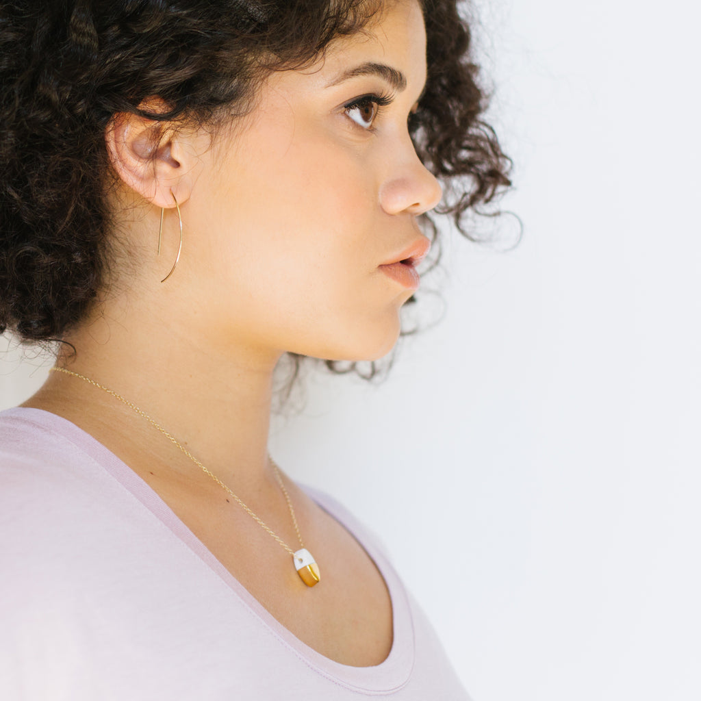 Our most popular pair of simply gold wired earrings have been paired with one of our most popular "in the round" necklaces. This set includes a pair of curve earrings and our ellipse necklace pair. Small and delicate, you'll forget you are even wearing jewelry but the compliments you receive will be sure to remind you. The set includes a custom gift box, velveteen bag, and free shipping!