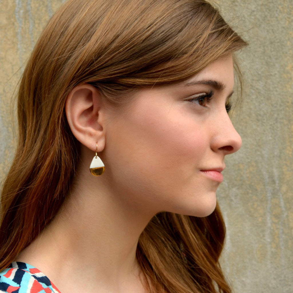 These earrings began as bits of wet porcelain clay. They were meticulously shaped, glazed and gilded, being fired three times throughout the course of creation. The juxtaposition of the smooth matte porcelain and the shiny gold glaze resulted in these works of wearable modern art that will feel luxurious against your skin.