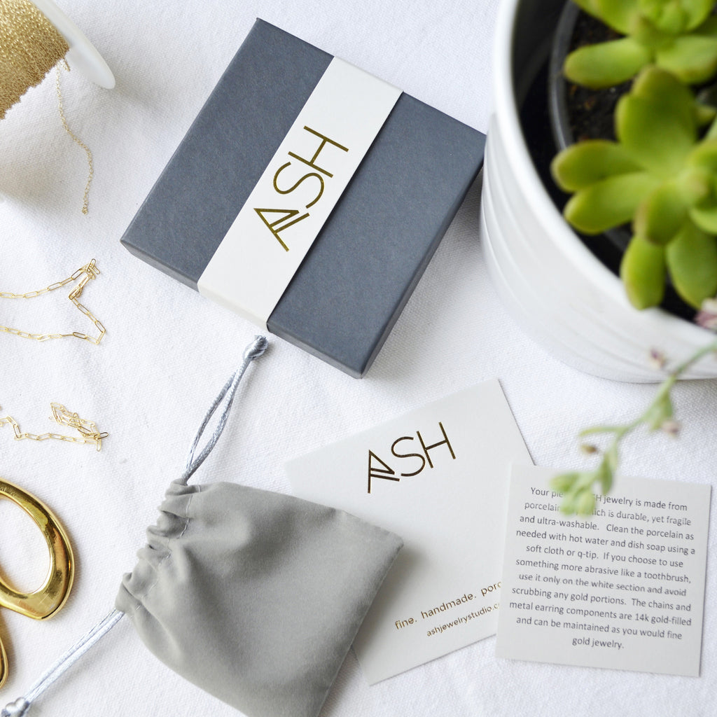 *Packaged in a jewelry box and ready to gift. A velveteen pouch is included in each jewelry box to keep your ASH piece in pristine condition while not in use.