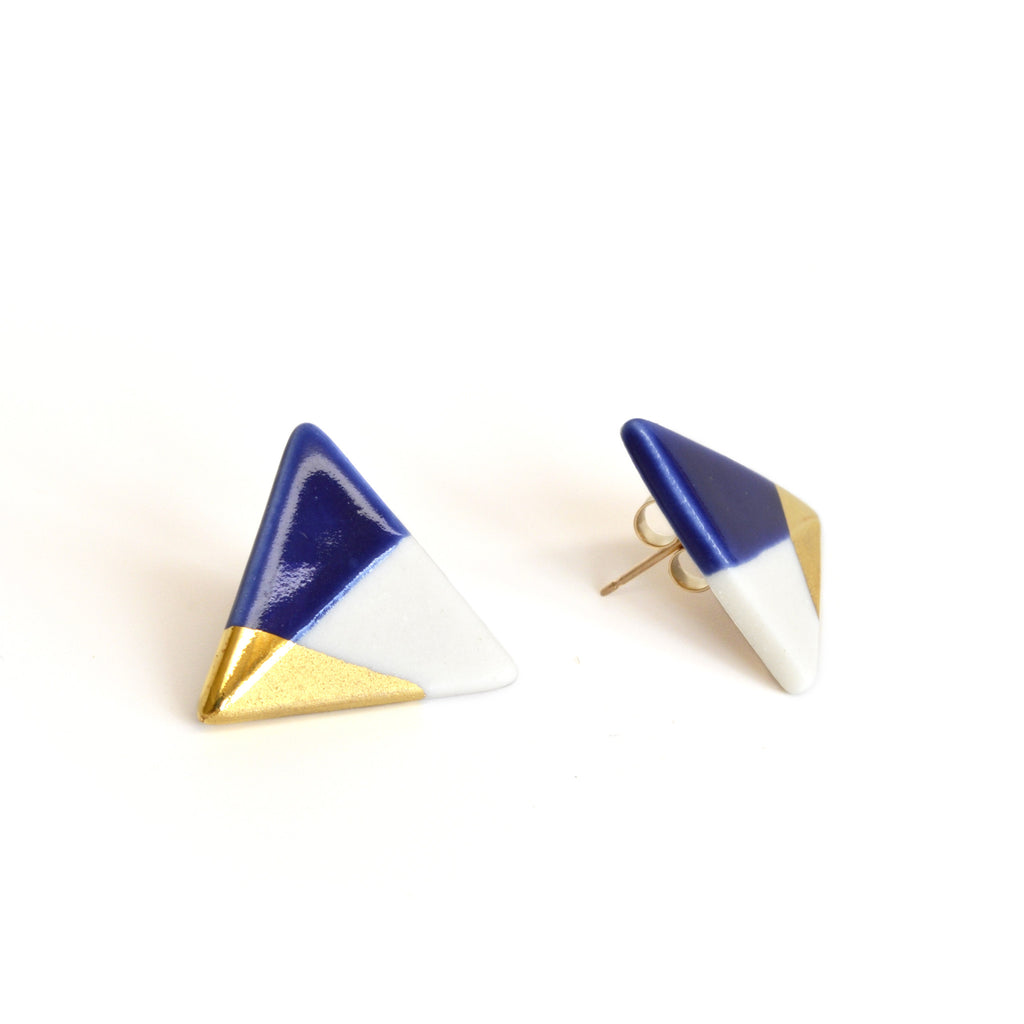 Gold dipped porcelain triangle stud earrings in royal blue