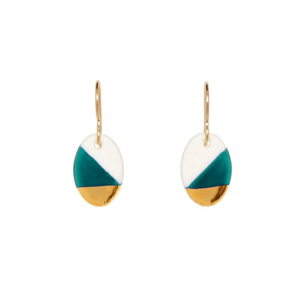 Small Porcelain Oval Dangle Earring in Teal with a Touch of Gold Glaze