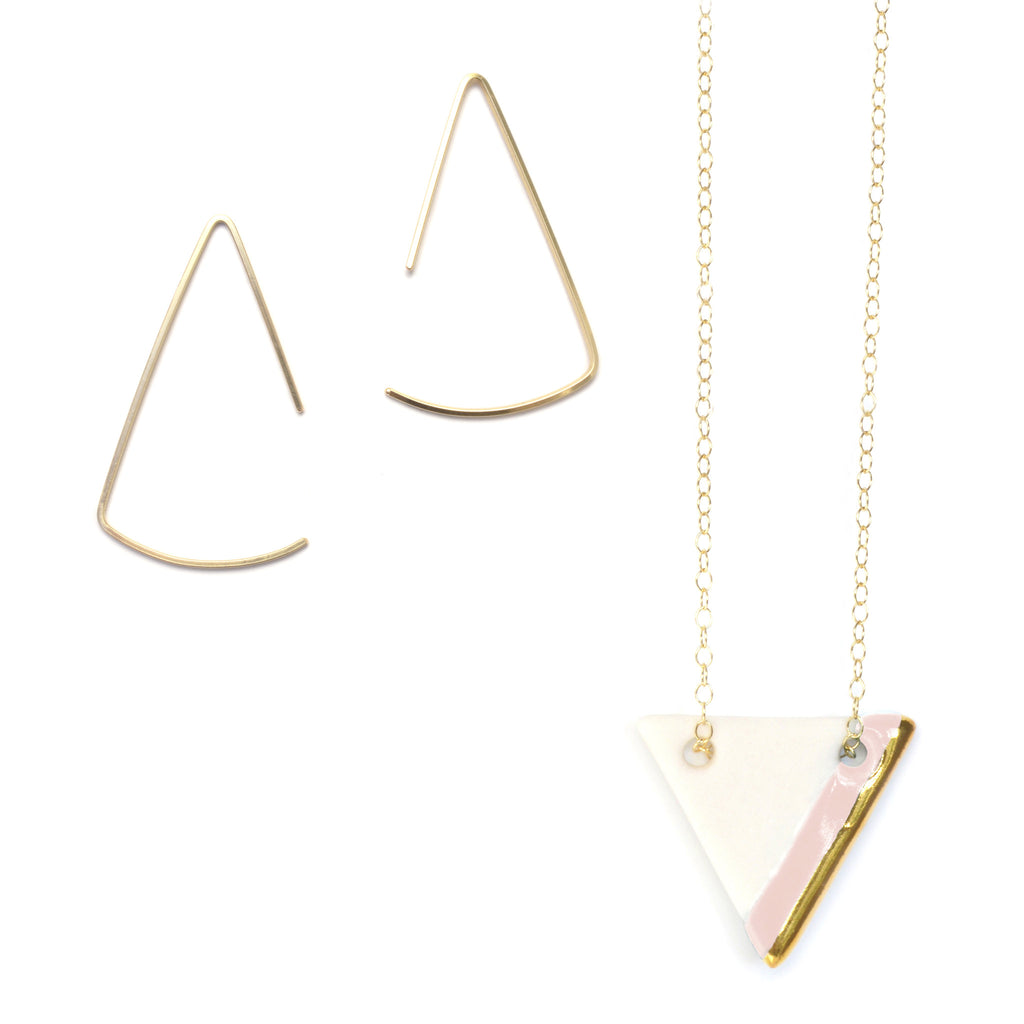 Our "pendulum" hoop style wired earrings and modern triangle porcelain necklace in blush pink are the perfect match. The set is complete with a custom gift box, velveteen bag, and free shipping!