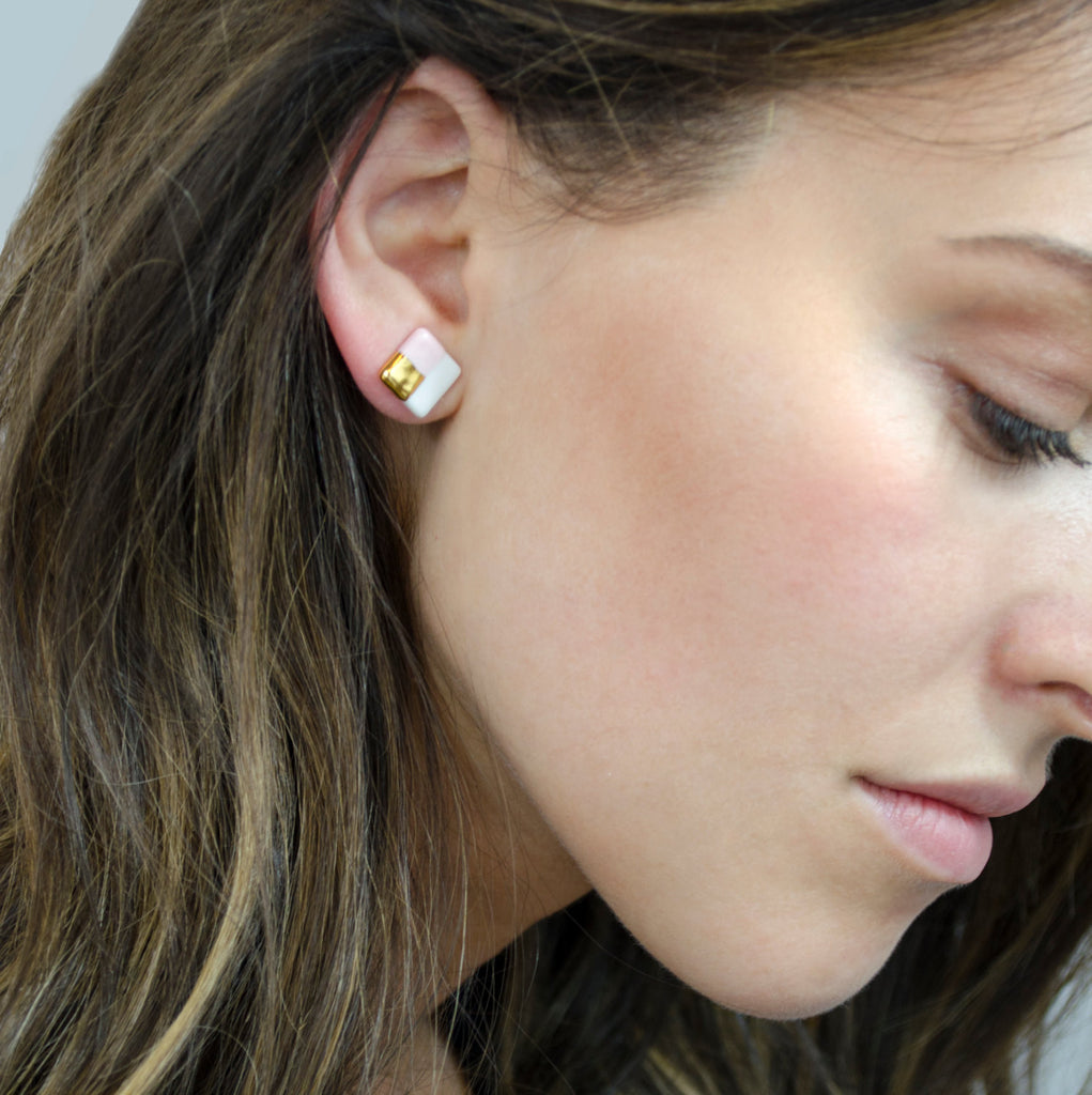 These Mondrian-inspired earrings began as bits of wet porcelain clay. They were meticulously shaped, glazed and gilded, being fired three times throughout the course of creation. The juxtaposition of the smooth matte porcelain and the shiny gold glaze resulted in these works of wearable modern art that will feel luxurious against your skin.