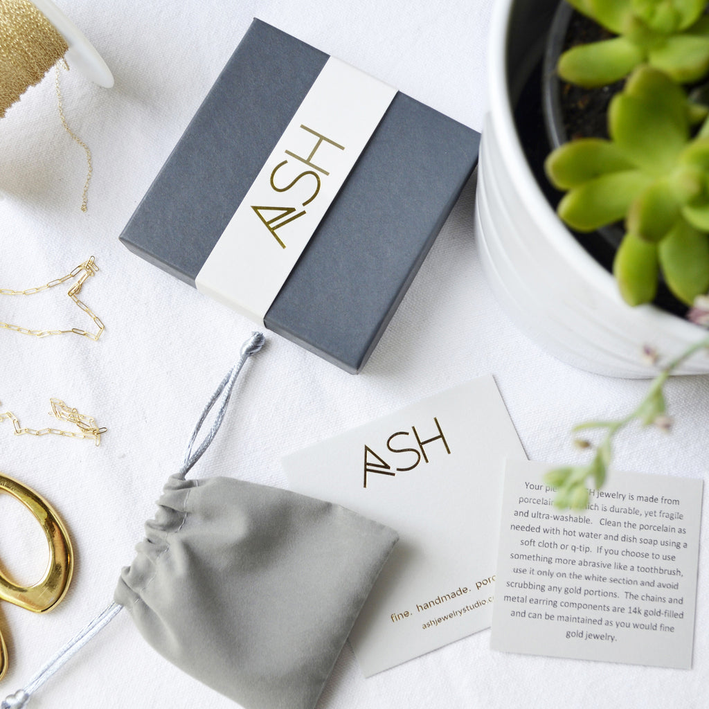 *Packaged in a jewelry box and ready to gift. A velveteen pouch is included in each jewelry box to keep your ASH piece in pristine condition while not in use.