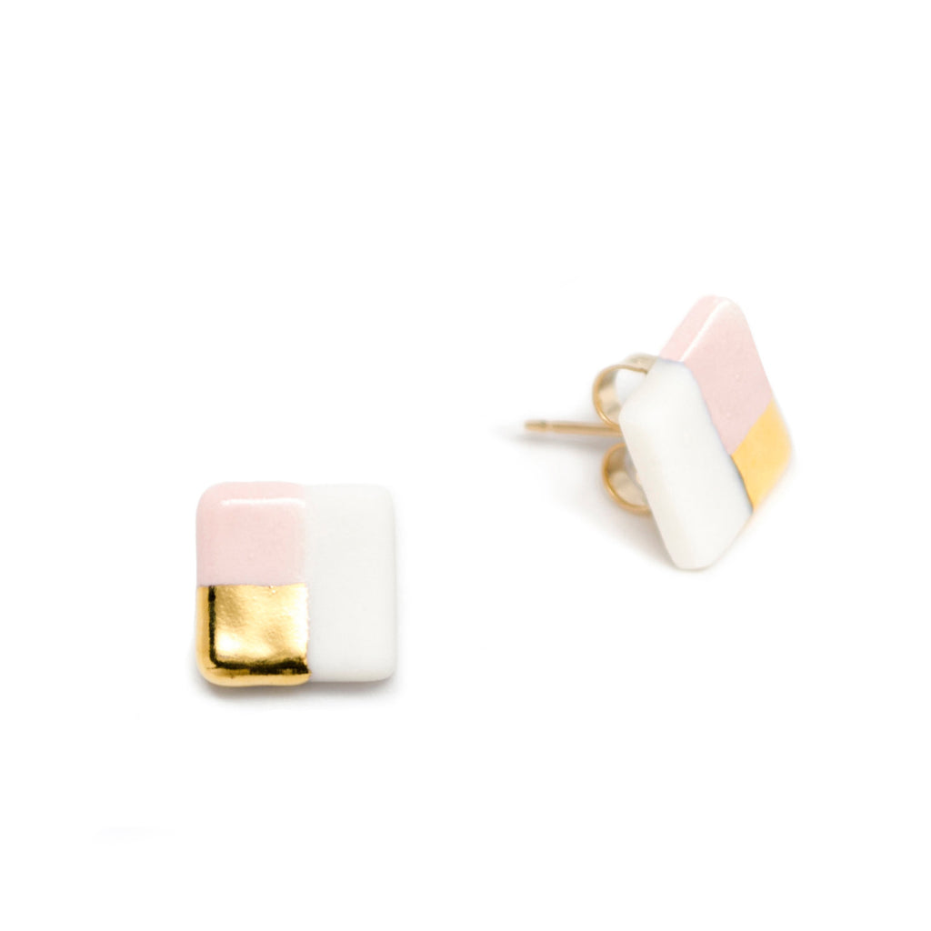 These earrings began as bits of wet porcelain clay. They were meticulously shaped, glazed and gilded, being fired three times throughout the course of creation. The juxtaposition of the smooth matte porcelain and the shiny gold glaze resulted in these works of wearable modern art that will feel luxurious against your skin.
