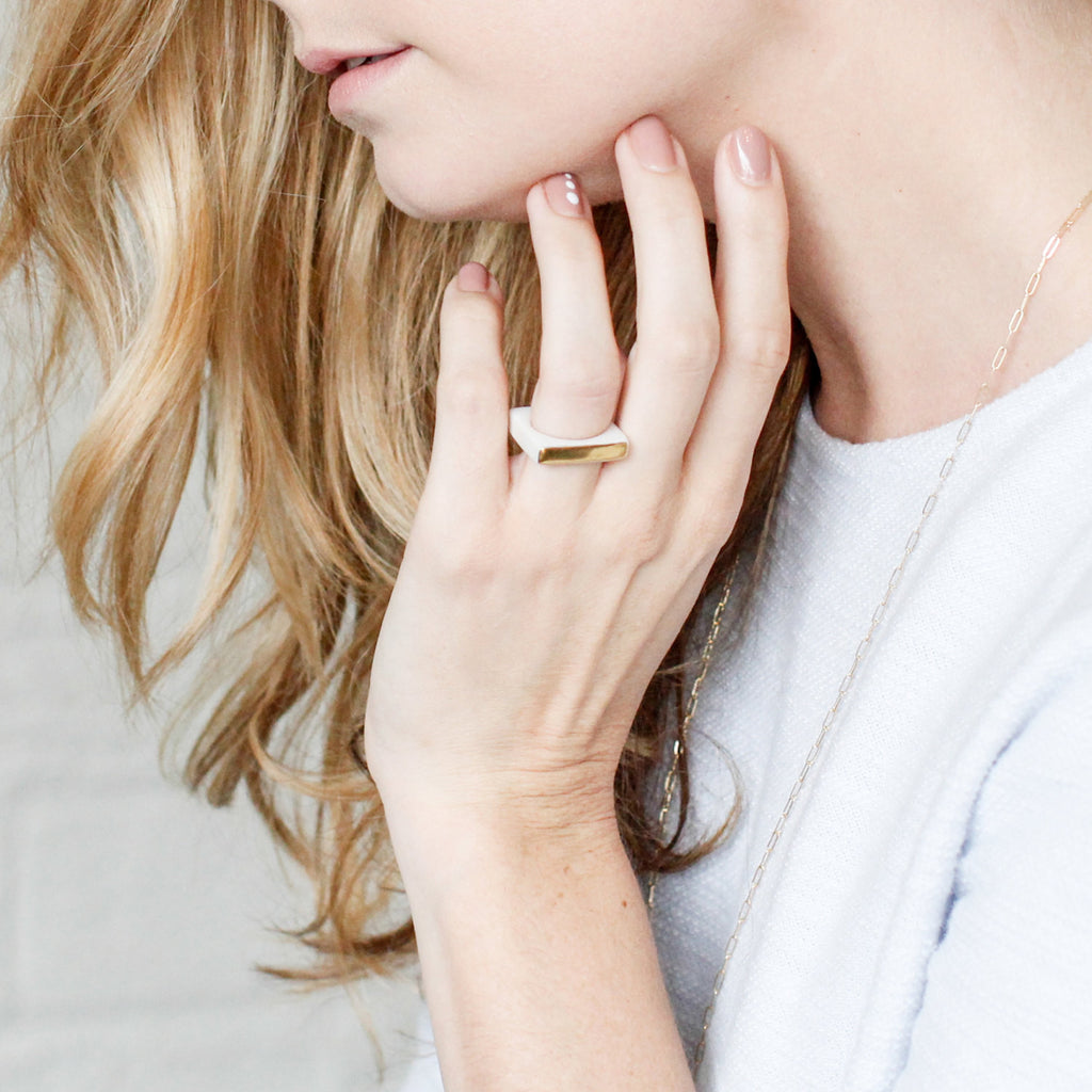 This ring, created with a bit of wet porcelain clay, was made by hand. With each firing in the kiln it became more refined, coming a step closer to perfection. The resulting ring is ultra-fine, geometric, and boldly modern.