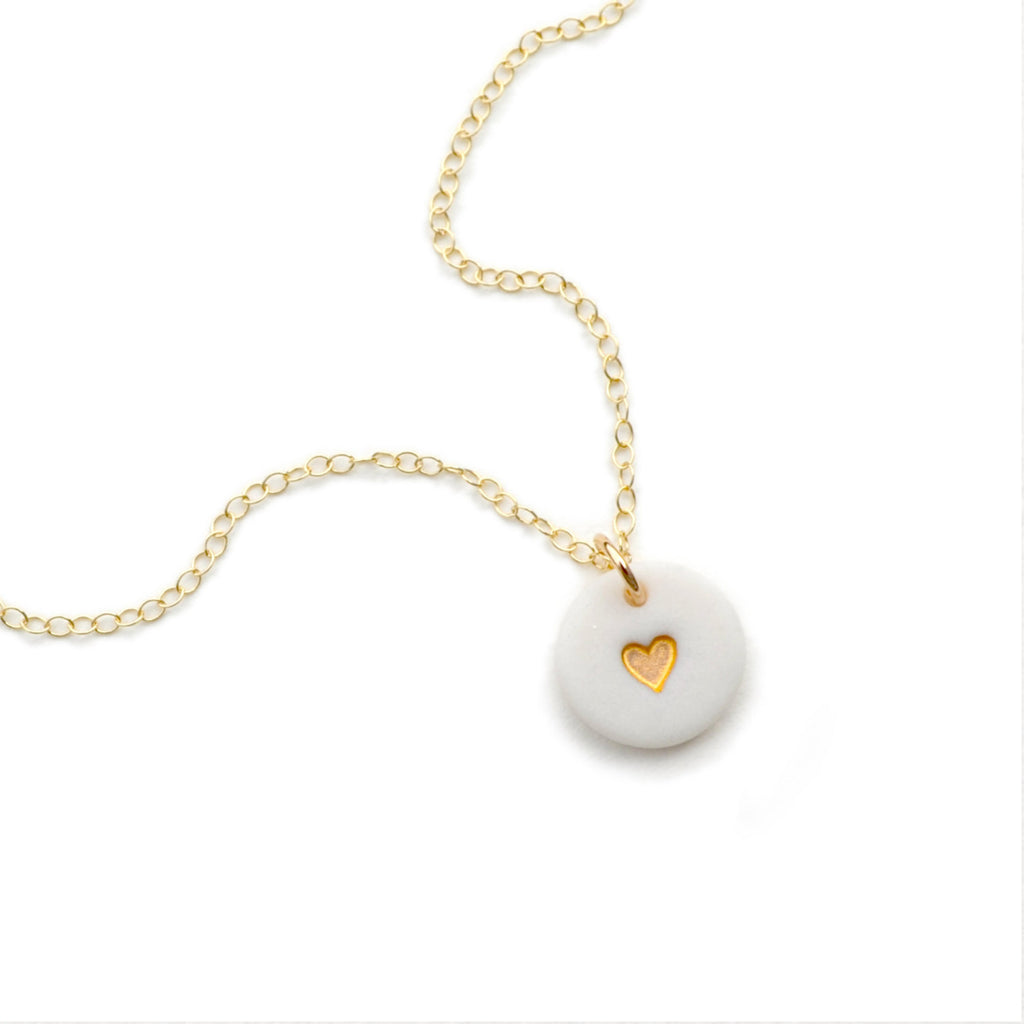This piece began as a bit of wet porcelain clay. It was meticulously shaped, pressed with a tiny heart and gilded, being fired twice throughout the course of creation. Perfect for a little girl, but sweet for any age.