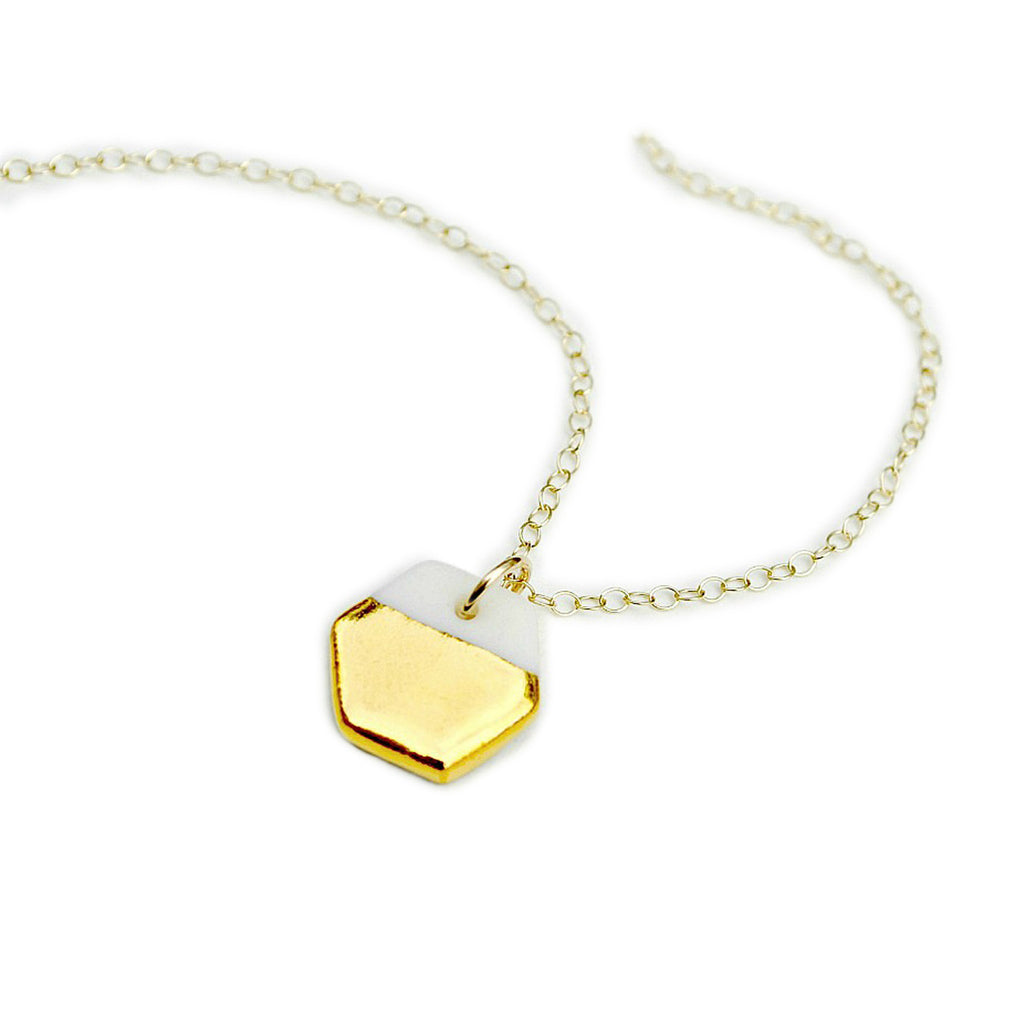 This piece began as a bit of wet porcelain clay. It was meticulously shaped, glazed and gilded, being fired three times throughout the course of creation. The juxtaposition of the smooth matte porcelain and the shiny gold glaze resulted in a work of wearable modern art that will feel luxurious against your skin.