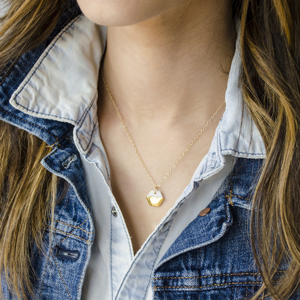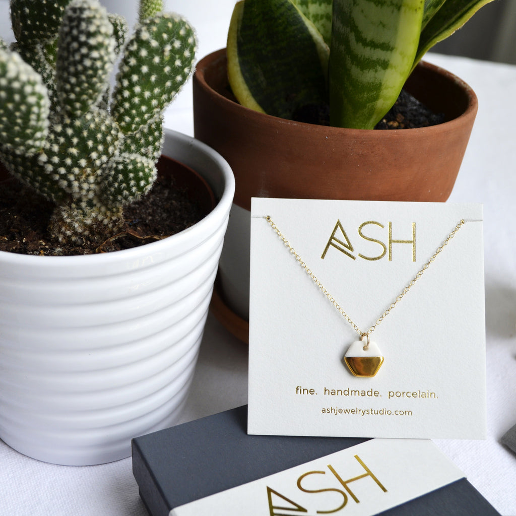 This tiny hexagon looks fabulous layered with either the large bar necklace or large square necklace also available from Ash.