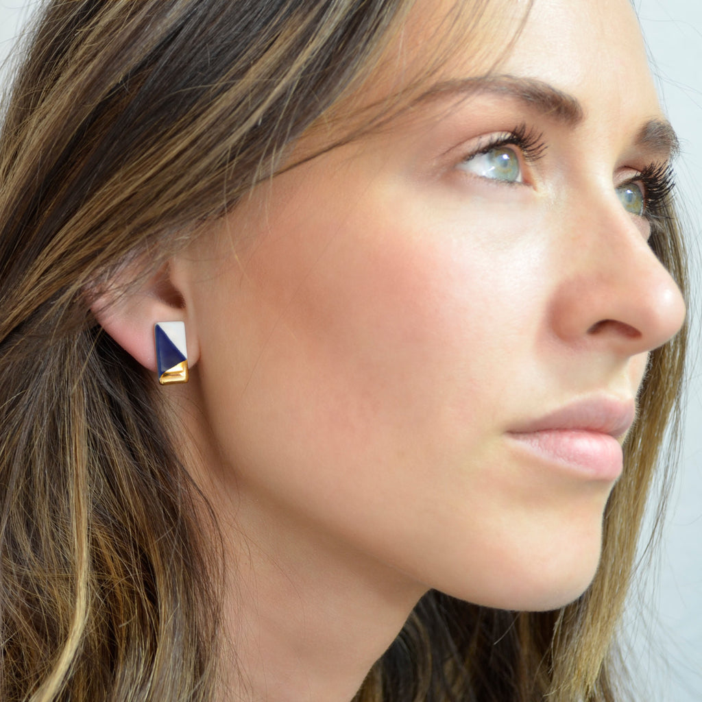 These earrings began as bits of wet porcelain clay. They were meticulously shaped, glazed and gilded, being fired three times throughout the course of creation. The juxtaposition of the smooth matte porcelain and the shiny gold glaze resulted in these works of wearable modern art that will feel luxurious against your skin.