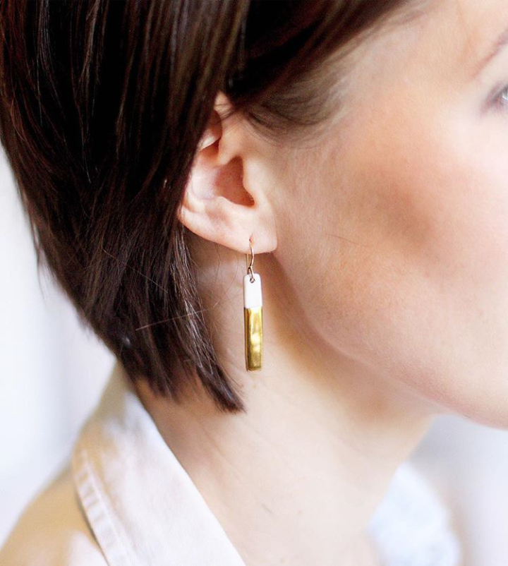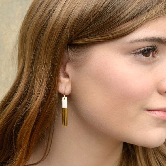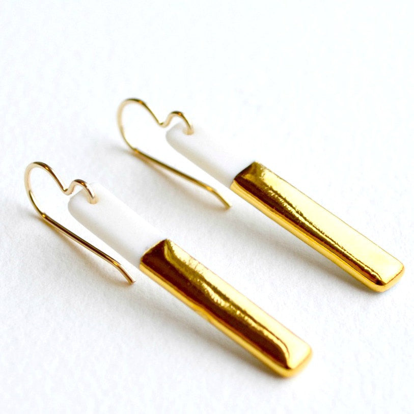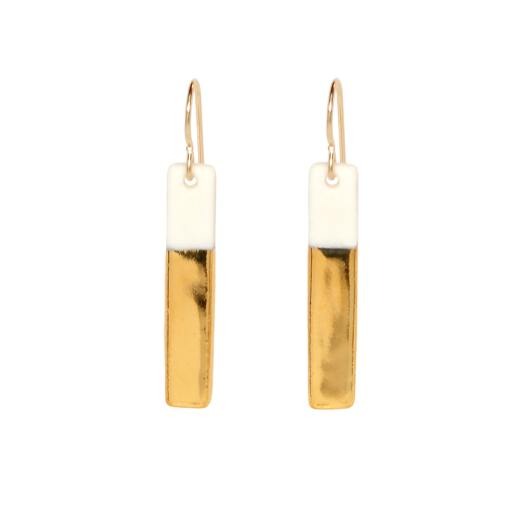 These earrings began as bits of wet porcelain clay. They were meticulously shaped, glazed and gilded, being fired three times throughout the course of creation. The juxtaposition of the smooth matte porcelain and the shiny gold glaze resulted in these works of wearable modern art that will feel luxurious against your skin.